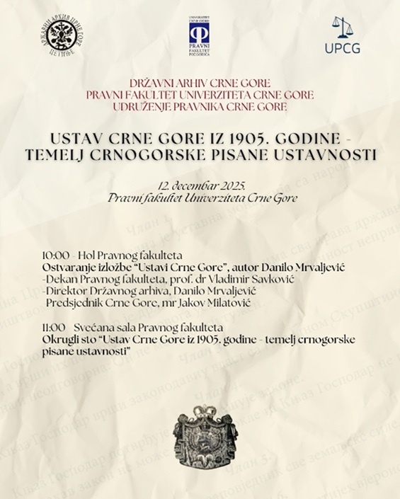 Nakon toga biće održan okrugli sto pod nazivom „Ustav Crne Gore iz 1905. godine – temelj crnogorske pisane ustavnosti“, posvećen sagledavanju istorijskog, pravnog i društvenog značaja ovog ključnog pravnog akta. Kroz naučni dijalog, učesnici će razmijeniti mišljenja i argumente od značaja za pravne, političke, istorijske i ukupne društvene okolnosti nastanka, razvoja i perspektiva crnogorske ustavnosti, sa posebnim fokusom na Ustav iz 1905. godine.